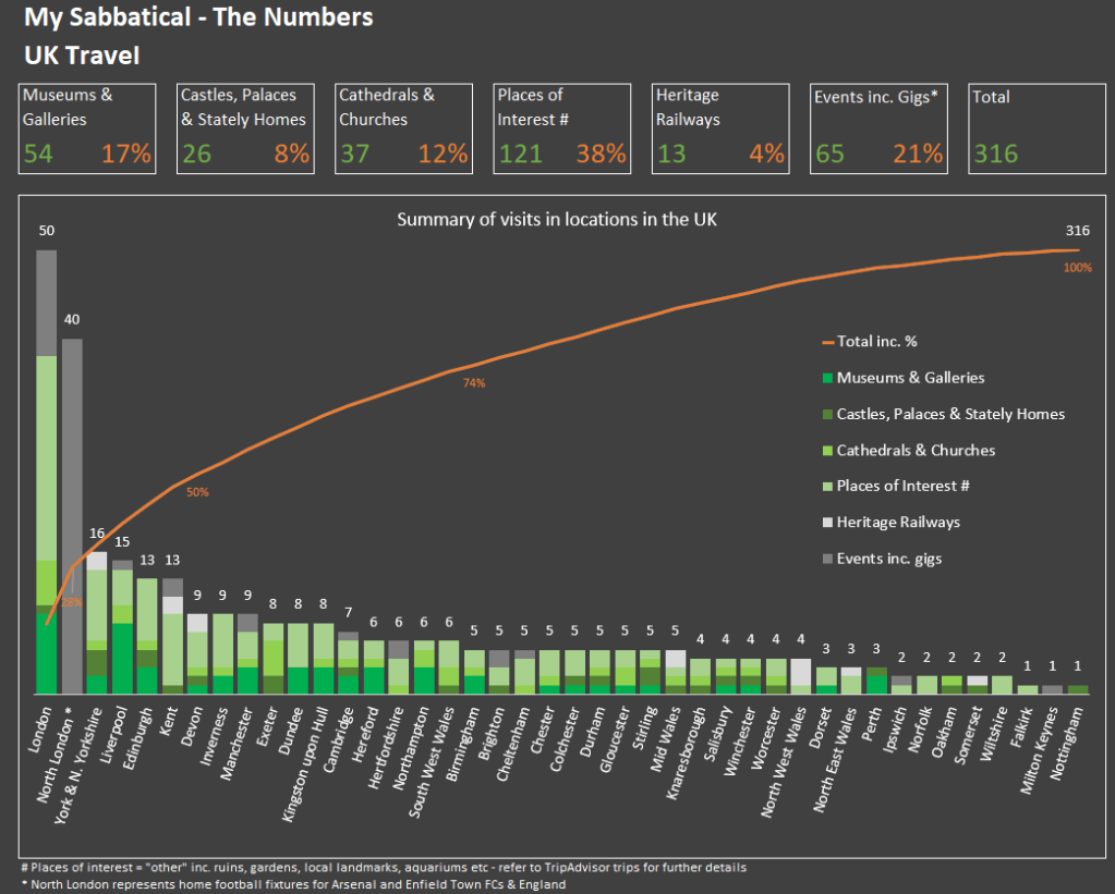 As I am returning to this role next week, I felt it would be good to get back into this mode by analysing the spreadsheet I have maintained throughout my sabbatical of the activities I have undertaken and places I have been. Yes, I maintained a spreadsheet because of course I did! Thus, here is an analysis of that data, written, to an extent, in the style I would present it to the business.