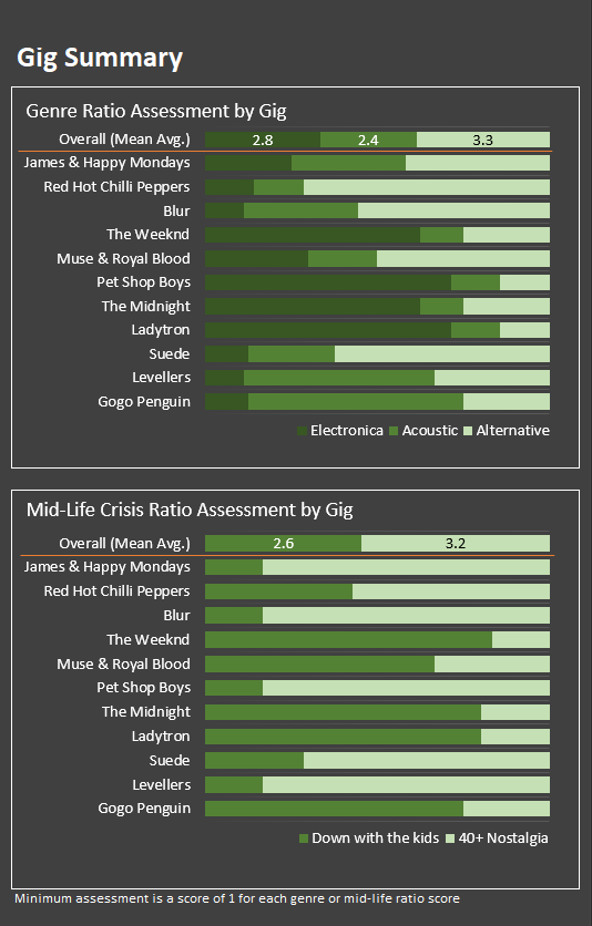 I was an unintended but ultimately enjoyable part of my sabbatical that I attended 11 music gigs. Looking at the list of artists, it struck me how different they are from each other in some ways and yet I felt it was important to do the proper analysis!