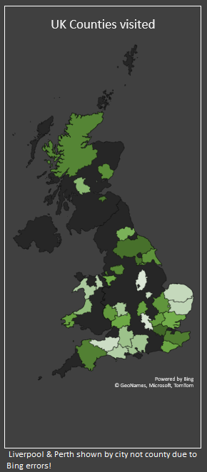 I’ve covered many miles in this time by plane, train and automobile! I’ve captured the counties of Great Britain that I have stopped in to visit a place on the dashboard. However, I have of course travelled through many more, to get to these destinations.